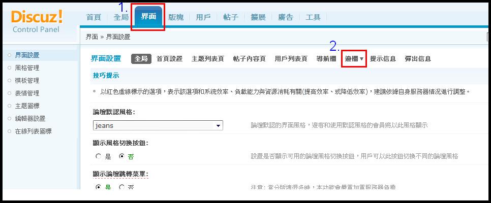 1. 登入Discuz後台,到界面裡的邊欄 > 全局