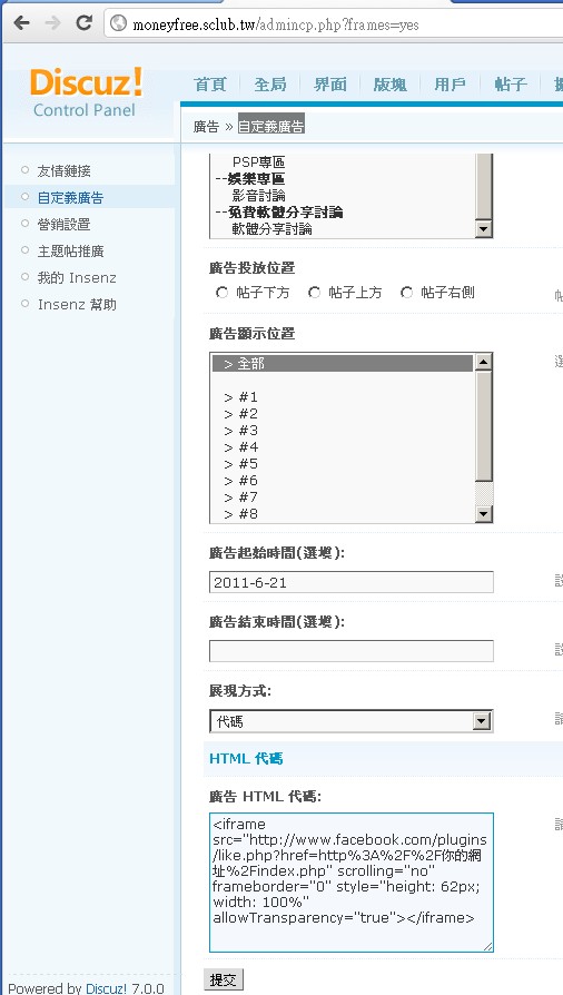 論壇系統設置>廣告>自定義廣告>添加>帖內廣告>廣告 HTML 代碼貼上代碼)